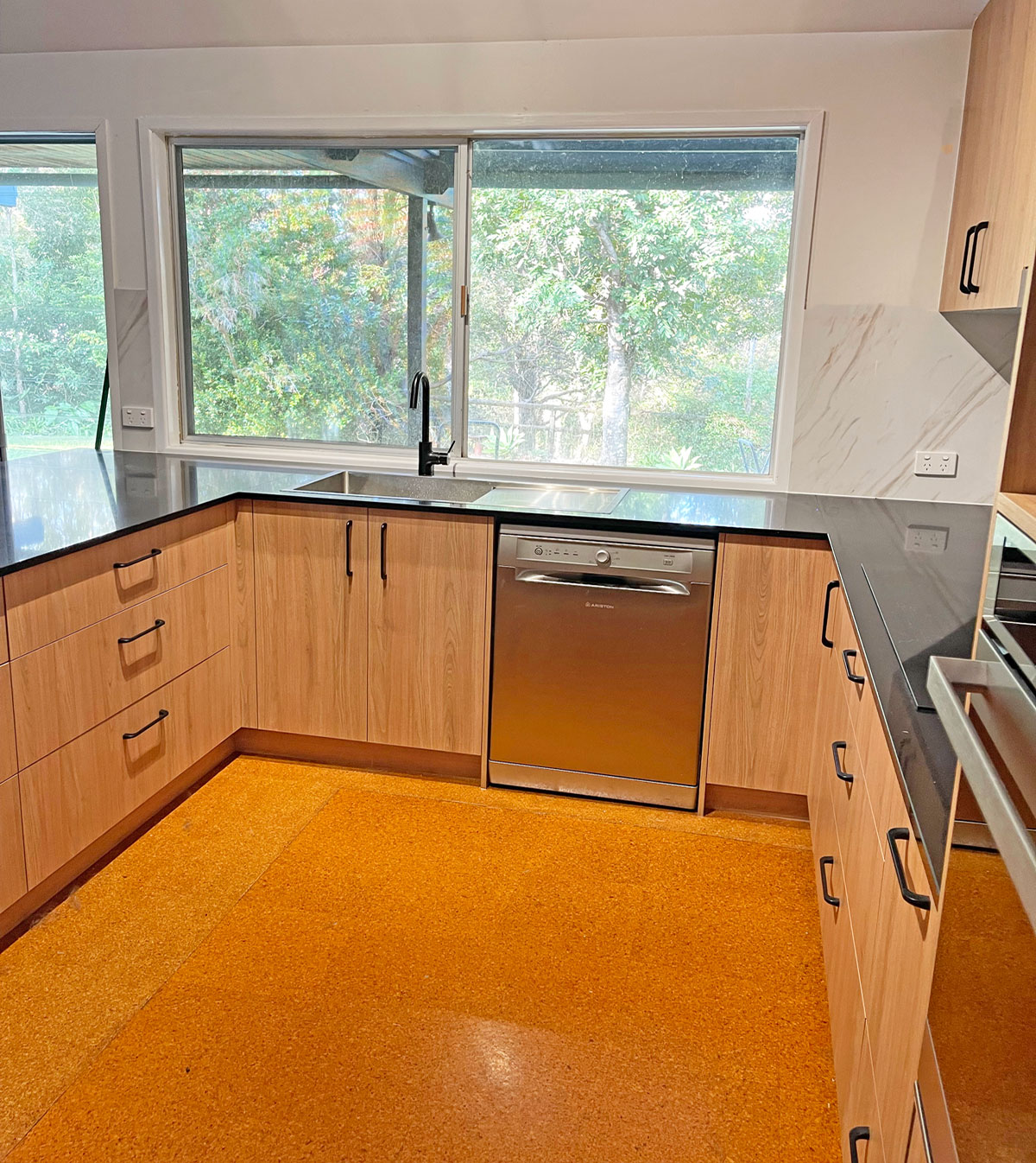 This kitchen renovation is a blend of natural textures and contemporary luxury. Cabinet doors are made from Polytec Tasmanian Oak Wood Matte, offering a refined yet organic feel. The centrepiece of the design is the YDL Silver Star Black 20mm stone benchtop adding a sleek, high-end touch thatโs as durable as it is striking. ๐
