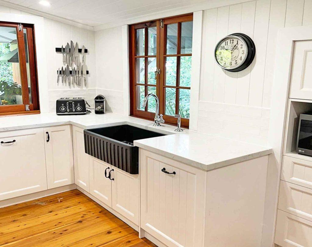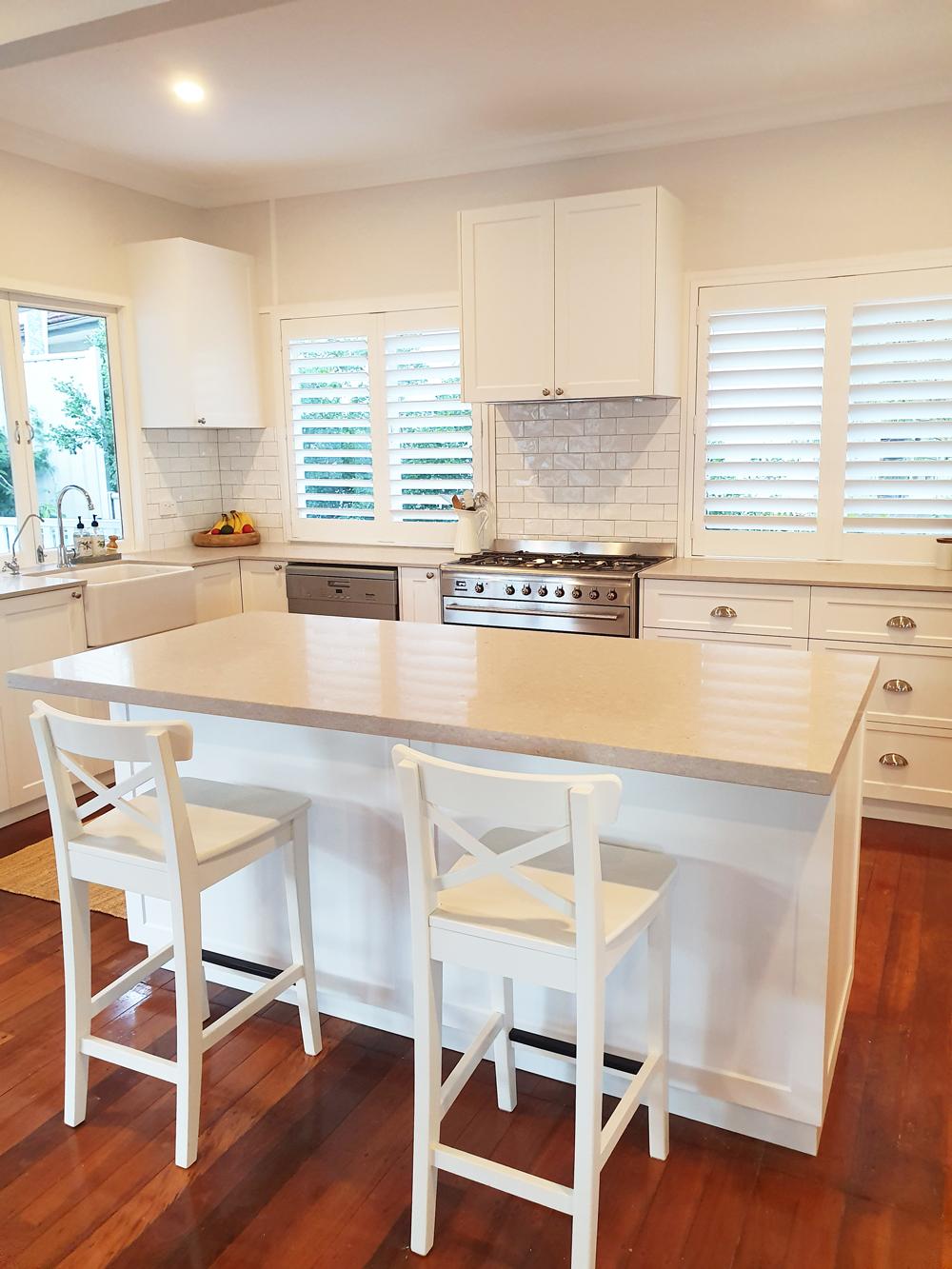 Beautiful White Kitchen with Ceaserstone Clambshell Benchtop.